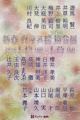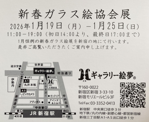 新春ガラス絵協会展 2025-12-25 00:32:09 新春ガラス絵協会展 会期:2026年1月19日(月)~1月25日(日) 会場:ギャラリー絵夢 〒160-0002 東京都新宿区新宿3―33―10 新宿モリエールビル3F ℡03-3352-0413