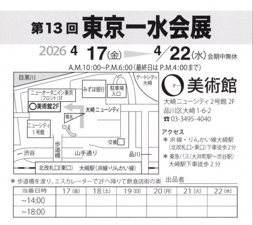 第13回 東京一水会展 2026-02-03 14:28:56 第13回 東京一水会展 会期 2026年4月17日(金)~22日(水) 10:00~18:00(最終日16:00まで) 会場 大崎ニューシティ2号館 2F O美術館