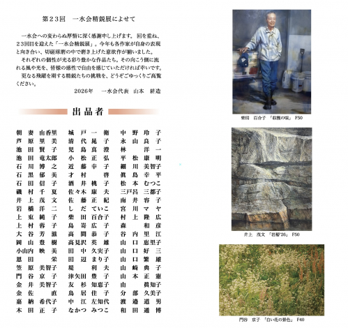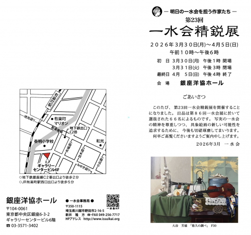 第23回 一水会精鋭展 2026-02-08 10:01:15 第23回 一水会精鋭展 会期 2026年3月30日(月)~5月5日(日) 10:00~18:00(初日13:00開場 最終日16:00閉場) 会場 銀座洋協ホール