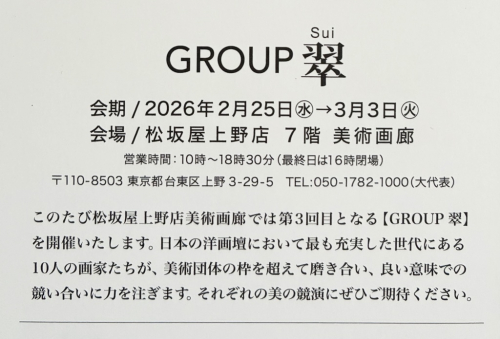 GROUP 翠 2026-02-19 13:31:08 GOROUP 翠 会期 2026年2月25日(水)~3月3日(火) 10:00~18:30(最終日16時閉場) 会場 松坂屋上野店 7階 美術画廊