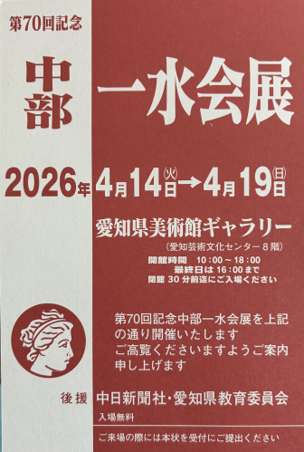 第70回記念 中部一水会展 2026-03-31 12:52:25 第70回記念 中部一水会展 会期 2026年4月14日(火)~4月19日(日) 10:00~18:00(最終日16:00閉場) 会場 愛知県美術館ギャラリー(愛知啓述文化センター8階) ※入場無料