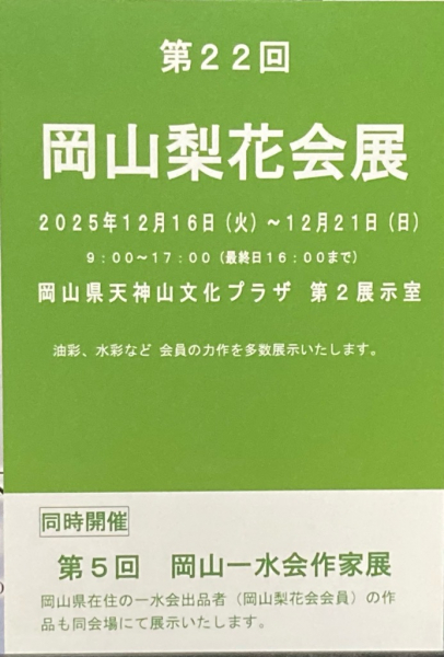 第5回 岡山一水会作家展 会期:2025年12月16日(火)~12月21日(日) 9:00~17:00(最終日16:00まで)開場:岡山天神...